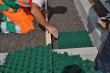 La posa è estremamente facile e rapida poichè ogni elemento è dotato di un particolare sistema di incastro, che funge anche da giunto di dilatazione e, nella parte inferiore, due punte che, migliorando l'ancoraggio al terreno, ne impediscono lo slittamento. La superficie di appoggio è pari al 50% del totale, permettendo così un efficiente drenaggio dell' acqua meteorica.