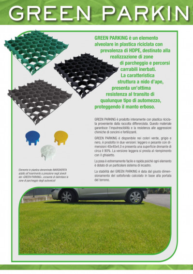 Green Parking può essere utilizzato solo ed esclusivamente quando gli alveoli vengono riempiti di terriccio o terriccio misto sabbia. è prodotto interamente con plastica riciclata più precisamente HDPE proveniente dalla raccolta differenziata. Questo materiale garantisce l'imputrescibilità e la resistenza alle aggressioni chimiche di concimi e fertilizzanti rendendo comunque facile il taglio dell'elemento secondo le esigenze. Presenta una superficie drenante di circa il 90%.