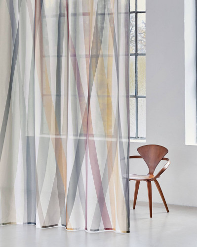 Bold strisce grafiche di diversi colori attraversano il tessuto in onde diagonali verticali e morbide creando interessanti moltiplicazioni cromatiche in cui si sovrappongono ad altri colori.