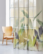 Tessuto trasparente per tende con grande motivo floreale. La stampa digitale raffigura foglie e piante di grandi dimensioni con texture emozionanti in tonalità di colore tenui e sottili su una base altamente trasparente in Trevira CS.