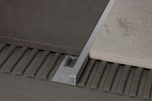 Una linea di profili con funzione di rifinitura, chiusura e  protezione nella posa di pavimenti di pari livello  in ceramica, marmo, granito, parquet o altri tipi di materiale. Risulta ideale anche come giunto di separazione e decorazione fra pavimenti realizzati in materiali differenti ( es. tra pavimento in ceramica  e parquet o moquette ), profillo perimetrale per il contenimento di zerbini, protezione per pedane e/o gradini in ceramica. Lo spessore a vista rende l’elemento di separazione visivo, integrandolo con il pavimento.