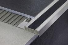 Profilo in acciaiio inox, per la realizzazione e protezione in fase di posa di gradini in ceramica marmo e pietra. Grazie all'aplicazione di strisce antiscivolo Safety-walk sulla superficie di pedata, risulta conforme alla norma DIN 51131 in materia di gradini antiscivoloo e particolarmente indicato per la protezione dei gradini sottoposti ad intenso traffico pedonale.