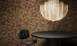 Rivestimento murale a base di lamina rivestito in sughero e finitura floccata, basato sulla pelliccia del leopardo barbuto - da giallo pallido a oro intenso, e una costellazione scura di boccioli di rosa che la adornano.