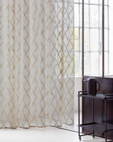 Tagliare la tecnica del filo in raffinata combinazione con filati di trama opachi e lucenti su una base leggermente ruvida. L'audace griglia diagonale leggermente irregolare è ammorbidita da uno spostamento del filo simile all'ikat che sfoca il contorno e lo rende più organico.