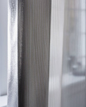 Leggi tuttoProtezione dall'abbagliamento e dal calore; Tessuto per tende dal sottile look a righe in larghezza 285 cm. Il tessuto a maglia trasparente in filato di filamento è alluminio metallizzato sul retro. Con il suo aspetto tecnico e l'elevata trasparenza